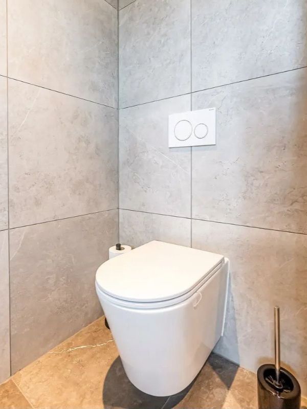De ruimte is voorzien van grootformaat keramische tegels en een nieuwe inloopdouche met matzwarte profielen. Nieuwe kranen, douche goot en verlaagd plafond zorgen voor een strakke en functionele afwerking.